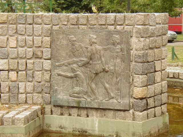 Grupo escultórico de bronce. Estatua de 2 m. con dos relieves laterales que simbolizan "Sacrificio de una virgen en aras del Dios de la lluvia" y "Gratitud al dios de la lluvia por el agua caída"