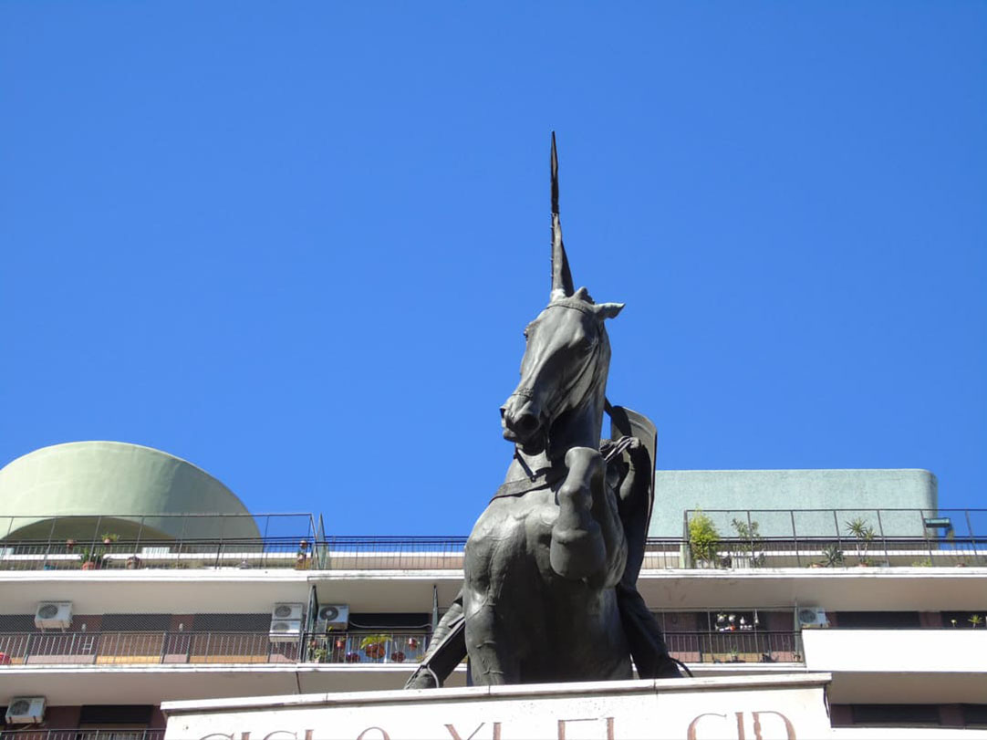 Figura ecuestre de bronce sobre base de mampostería revestida en mármol travertino, simboliza al héroe español Ruy Diaz de Vivar.