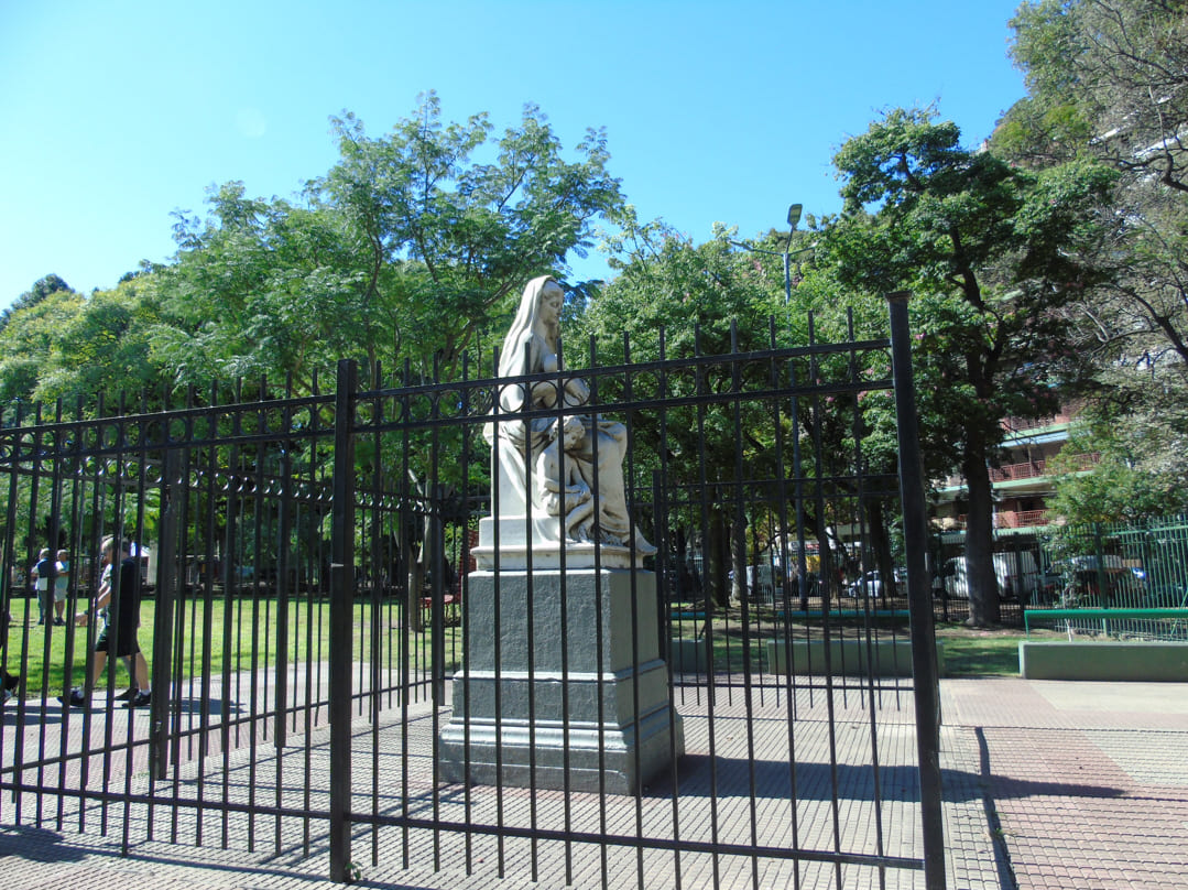 Obra de mármol de Carrara sobre base de mampostería, representando una figura femenina simbolizando “LA MATERNIDAD” con tres criaturas, a una de ellas amamantando, el conjunto expresa la virtud teologal de amar a Dios sobre todas las cosas y al prójimo como a nosotros mismos.