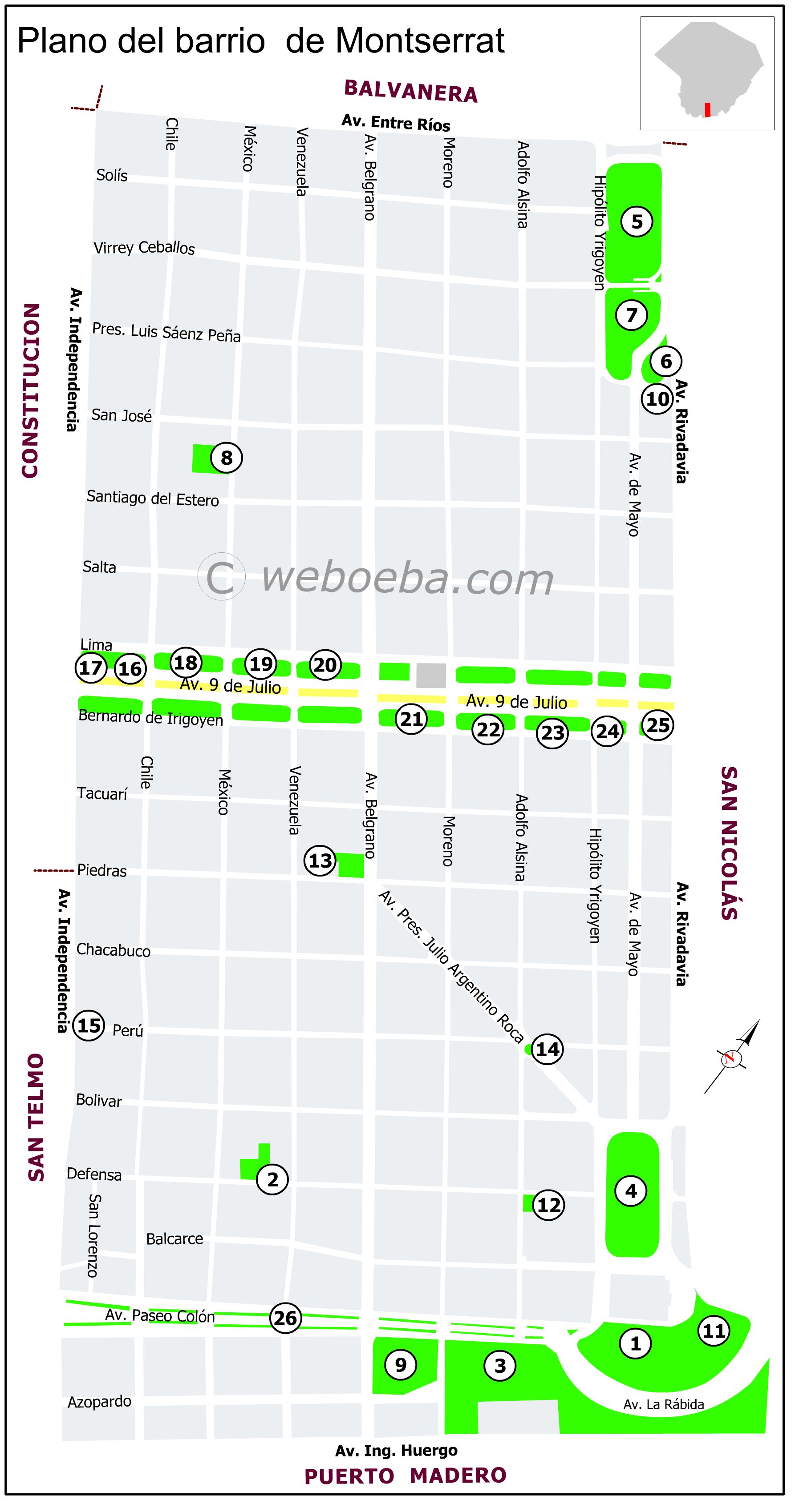 Parque 1 - Colón Plazas 2 - De la Defensa 3 - De las Armas 4 - De Mayo 5 - Del Congreso 6 - Lorea 7 - Mariano Moreno 8 - Montserrat Plazoletas 10 - Del Mercado Modelo 11 - 11 de Junio de 1580 12 - Héroes de Malvinas 13 - Int. Joaquín S. Anchorena 14 - Ricardo Tanturi 15 - Rodolfo Walsh Paseos 16 - De la Cultura y Ciencia Árabes Canteros 17 - Provincia del Chaco 18 - Provincia de Chubut 20 - Provincia de Formosa 21 - Provincia de Jujuy 24 - Provincia de Mendoza 26 - Francisco Pracánico Los números de los canteros centrales que se encuentran sobre la Av. 9 de Julio corresponden a ambos lados de la avenida, con excepción del Paseo de la Cultura y Ciencia Árabes. |