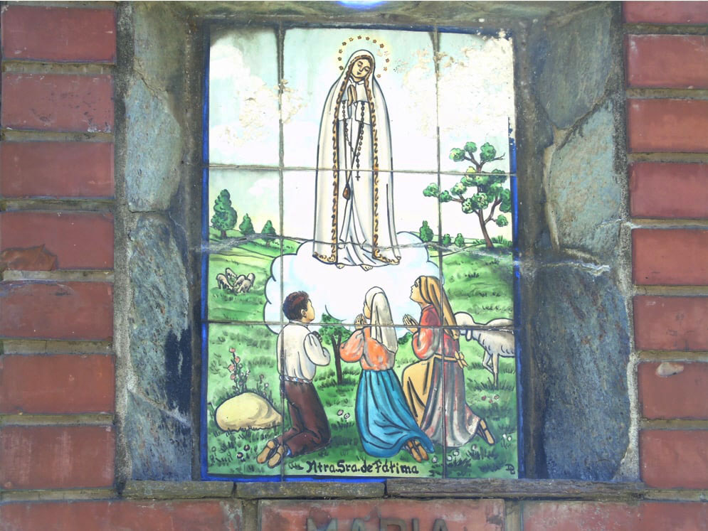 De mampostería. Cuadro de mayólica de 0,30 por 0,45 m adosado al monolito.