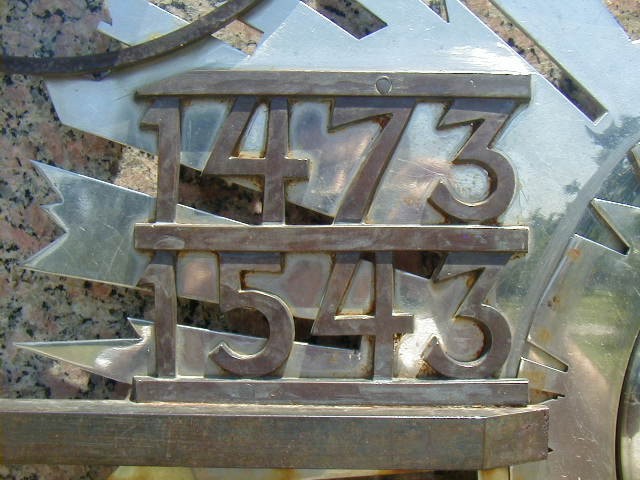 Pantalla de granito rojo Córdoba de 1,70 h x 1,20 de ancho con un relieve con la efigie de Copérnico de 0,80 x 0,70 (1473-1543) y un cuadrante con el sistema solar de 0,80 de diámetro.