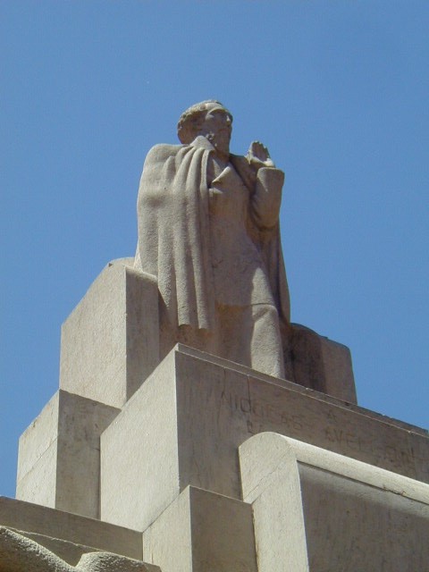 Monumento de mármol travertino nacional. En el frente, en primer plano, se encuentra la figura sedente que simboliza “LA REPÚBLICA”, sobre una columna central corona el monumento la figura del prócer que se encuentra de pie en actitud parlamentaria. En la parte media del monumento se encuentran cuatro relieves del mismo material, que ilustran lo más saliente de la gestión gubernamental. A los laterales se encuentran las figuras femeninas que simbolizan “EL SABER” y “LA PAZ”.