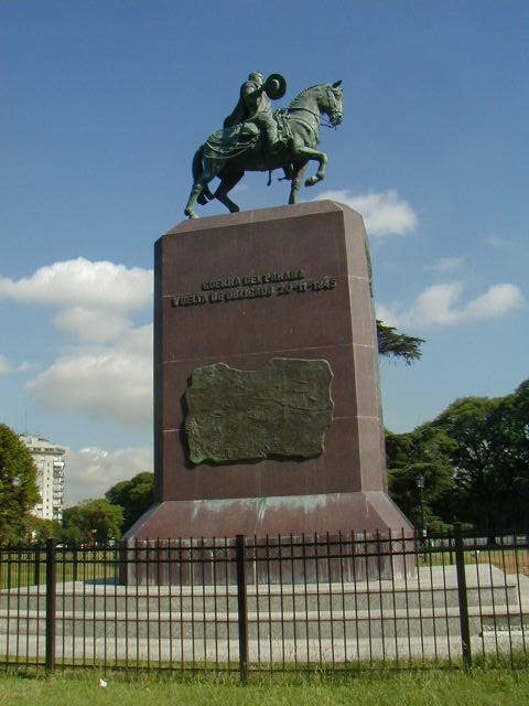 Obra ecuestre de bronce sobre un basamento revestido en granito gris martelinado. El pedestal de 12 m. de altura es de granito rojo martelinado. La fundición en bronce de la estatua ecuestre se realizó en Italia. En los laterales de la base se encuentran grabadas una cita del General José de San Martín, y relieves de bronce alegóricos al Combate de La Vuelta de Obligado, al Pacto Federal de 1831 y a la Campaña del Desierto. La estatua ecuestre tiene las siguientes dimensiones aproximadas: 3,50 m. de ancho x 4,00 m. de alto.
