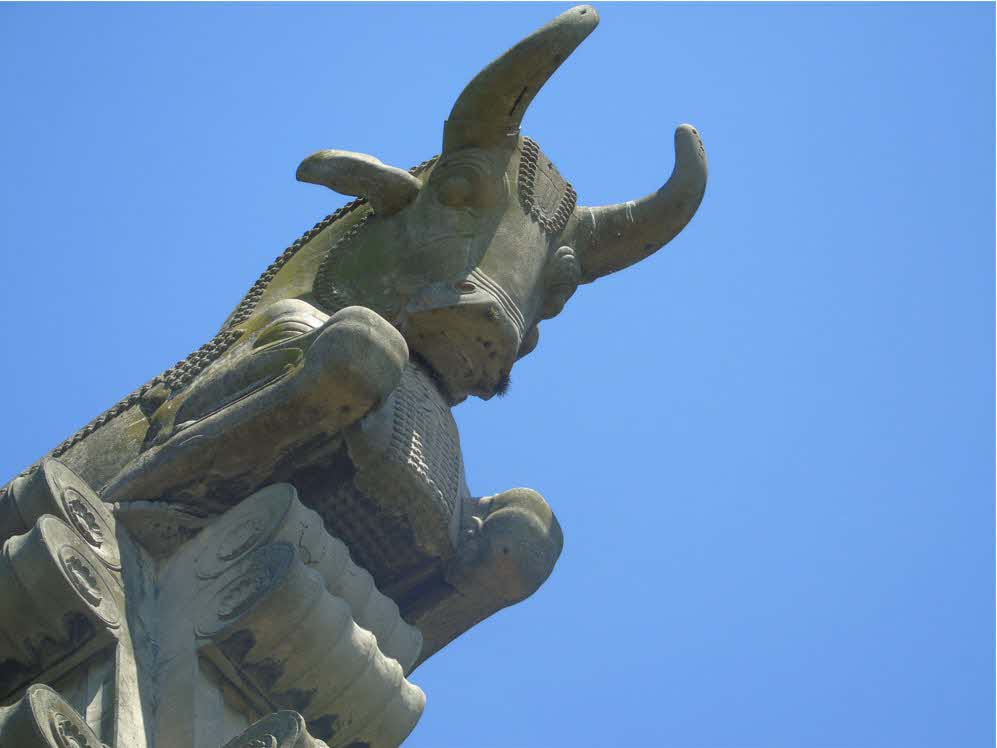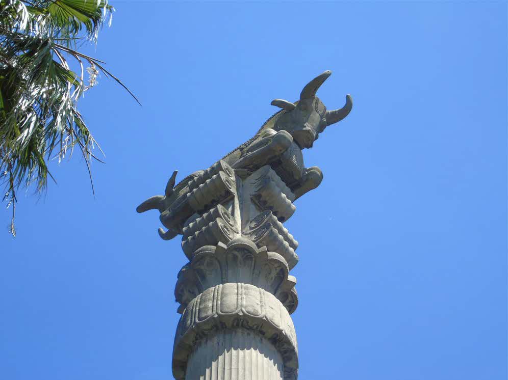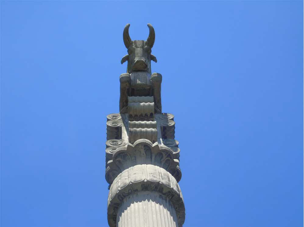 Pieza arqueológica en forma de capitel, emplazada sobre reproducción de columna, perteneciente al Palacio de Astarjerjes en Susa. La altura aproximada de la obra es de 30,00 m.