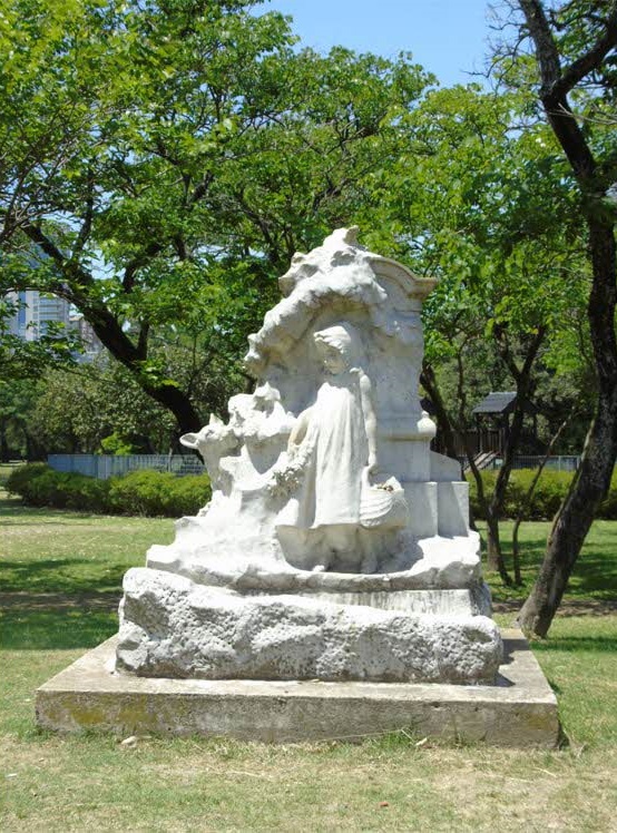 Realizado en mármol blanco, representa el conocido cuento del escritor francés Claudio Perrault Nodier. Caperucita Roja lleva una cesta en su mano izquierda y un ramo de flores en su derecha, por detrás se observa el lobo acechándola. Medidas aproximadas: 1,80 m. de altura x 1,20 m. de base, total de la obra: 2 metros.