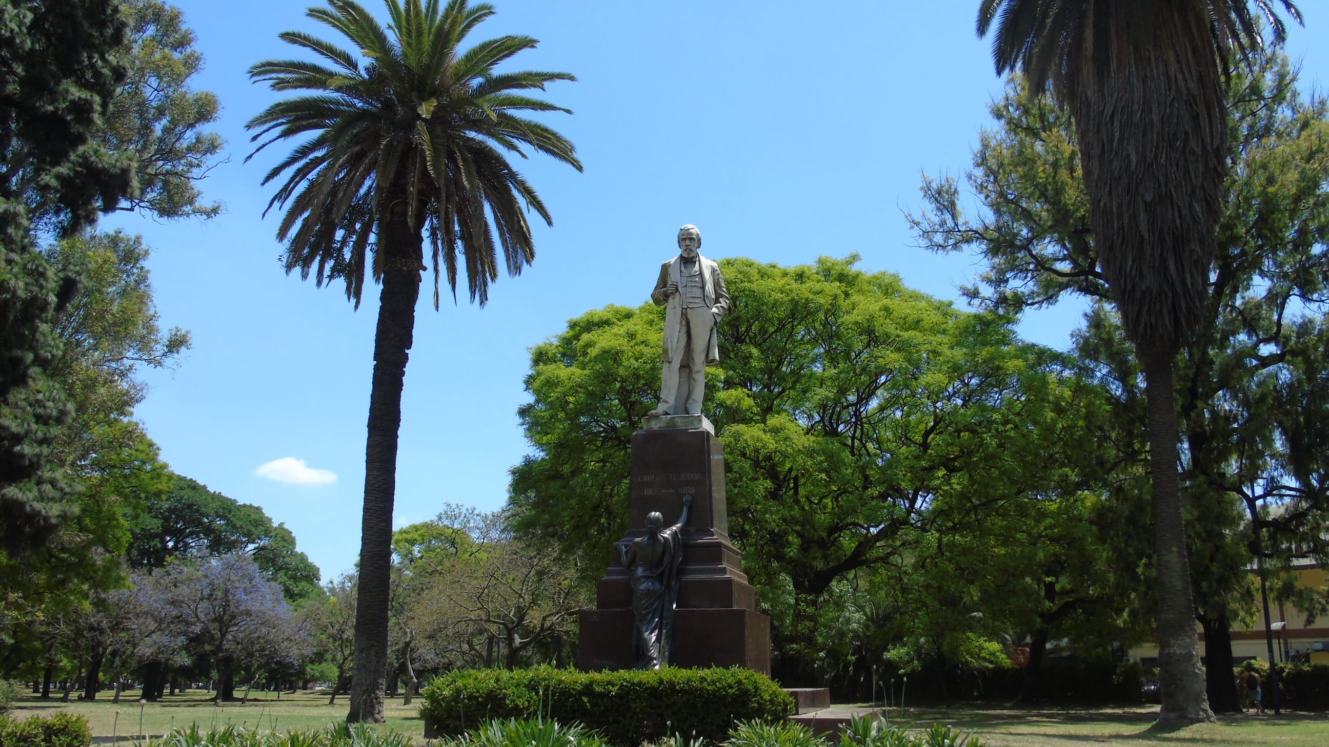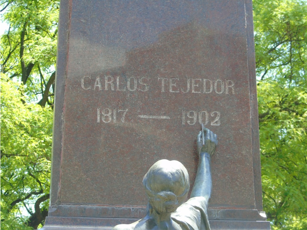 Sobre una base de granito cuadrangular que mide aproximadamente 1,50 m. se sienta la figura del prócer, representado de pie en actitud pensante, realizada en mármol de Carrara. Al pie y al frente de la base revestida en granito lustrado se encuentra una figura femenina que representa “LA HISTORIA” en actitud de grabar en la base la inscripción: “CARLOS TEJEDOR” “1817-1903”.