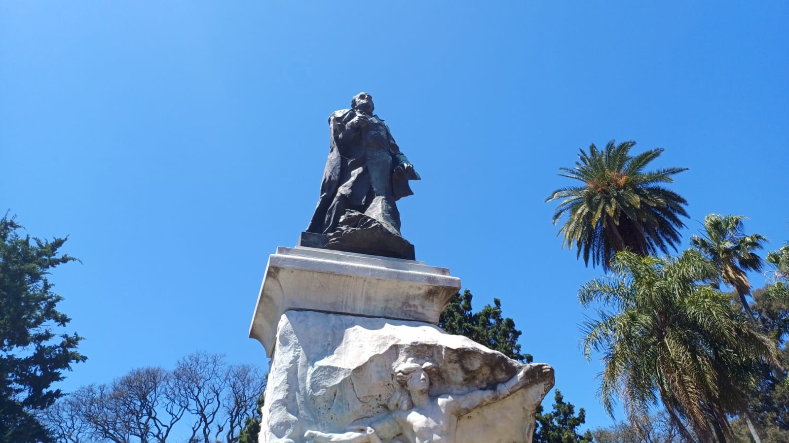 Escultura de bronce sobre base de piedra y mármol de Carrara. La figura se presenta en actitud propia, en el frente de su base, se observa un relieve de mármol, con la figura de “APOLO”, genio de la luz, símbolo de la ciencia, que avanza alejando las tinieblas, mientras la serpiente Pitón, símbolo de la Ignorancia, se retuerce en agonía perdiéndose en la oscuridad. En la parte posterior se aprecia una interpretación del Escudo Nacional, También en mármol.
