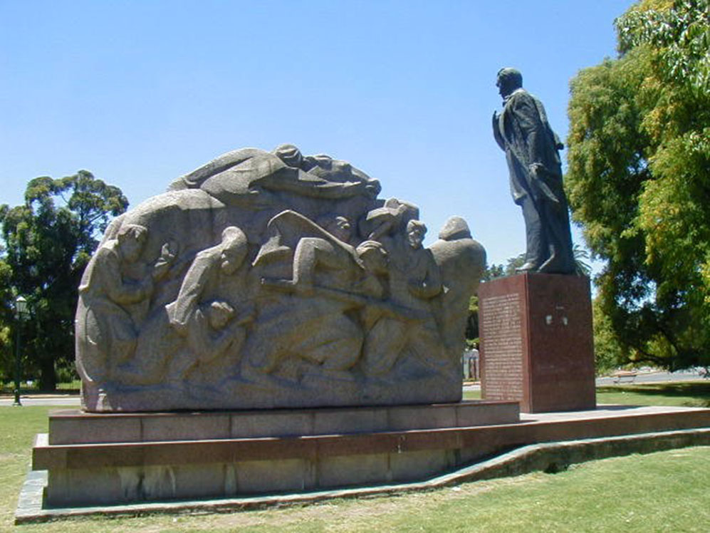 Figura de bronce de 3,45 m. de altura parece avanzar con gestos declamatorios. Sobre el pedestal de granito rojo dragón hay varias inscripciones con fragmentos de la obra del escritor y su lucha incansable por la libertad de su patria. A su derecha se encuentra un doble relieve en un bloque único de granito, obra del escultor Orio Dal Porto. El mismo presenta ocho personajes populares que avanzan tumultuosamente y en conjunto hacia el extremo izquierdo del bloque.