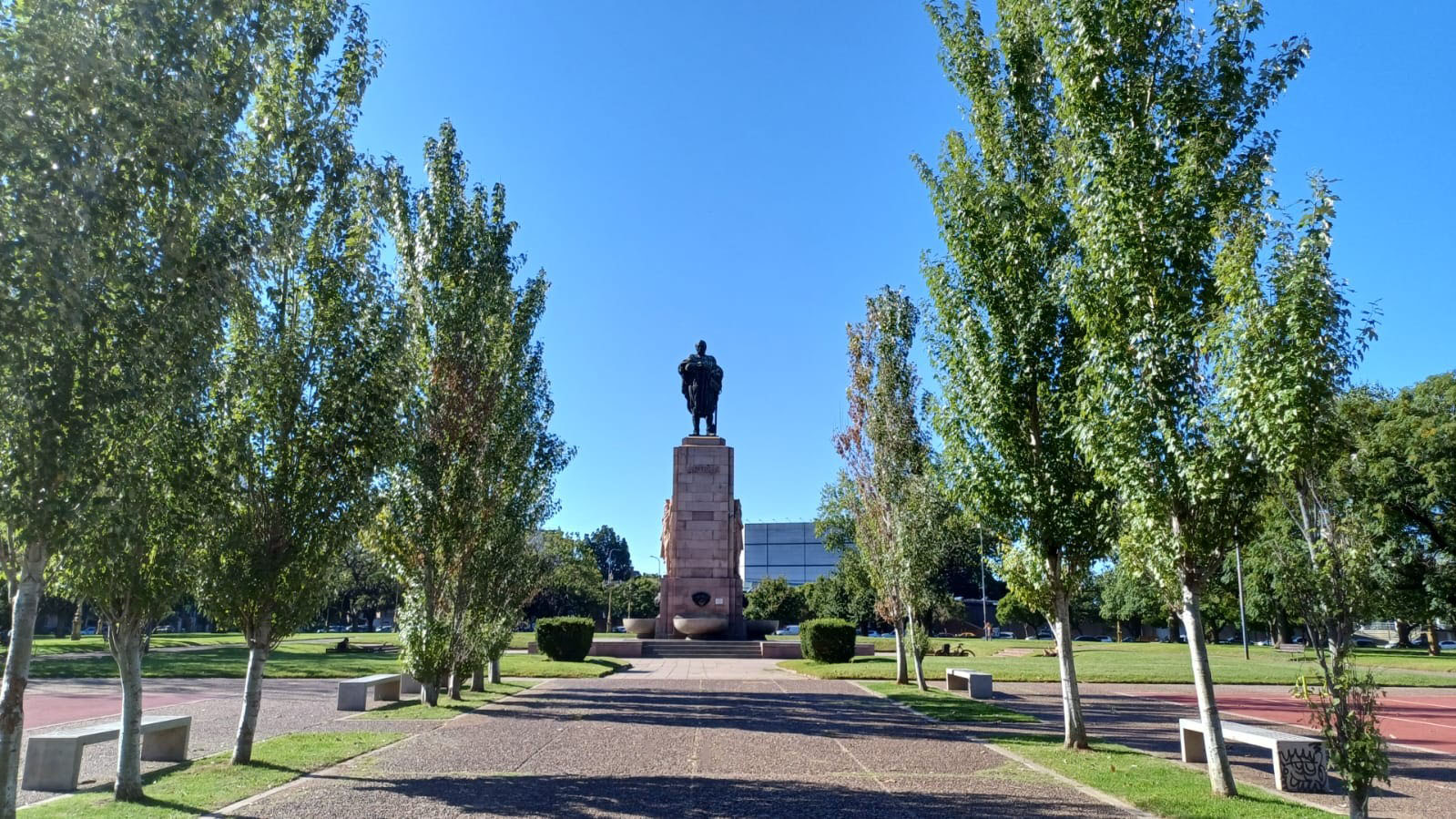 De bronce de 6 metros de altura, base de mampostería revestida en granito rojo dragón de 12 metros de altura; 2 bajos relieves de granito, que simbolizan La Libertad y La Federación y 4 grifos que simbolizan los ríos EL PLATA, URUGUAY, PARANA y PARAGUAY