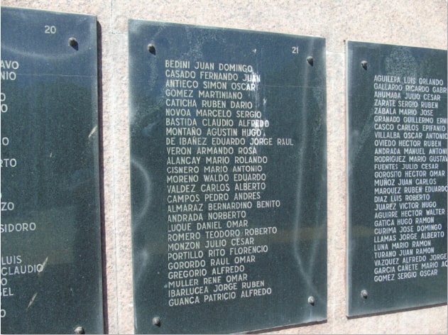 Cenotafio que ocupa una superficie aproximada de 263 m2 inserto en un corte en la barranca de la plaza. Es un diseño semicircular conformado por un muro vertical revestido en granito rojo dragón martelinado al cual se encuentran adosadas 25 placas de granito negro grabadas con los nombres de los 649 combatientes.