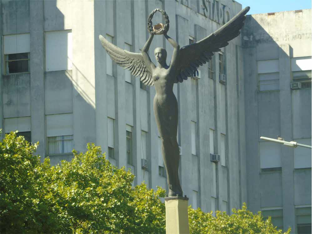 Obra de bronce, representando una mujer alada que simboliza el eterno ideal del hombre por volar y dominar el espacio, la actitud y movimiento de esta figura sugieren una poderosa fuerza ascendente, sus brazos en alto refuerzan esa impresión y añaden simbolismo de triunfo y gloria en los laureles que sostiene, alcanzados por aquellos que se dedican en el espacio a buscar nuevos caminos para la humanidad.