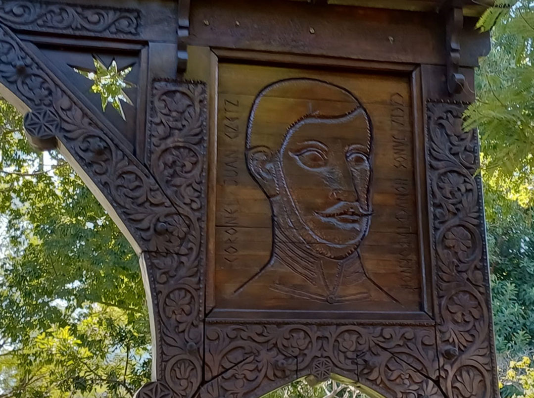 Típico Portón Székely (sículo), tallado en madera, obsequio de la Federación de Entidades Húngaras de la República Argentina en ocasión del milenio de la fundación del estado húngaro, en el año 2000.