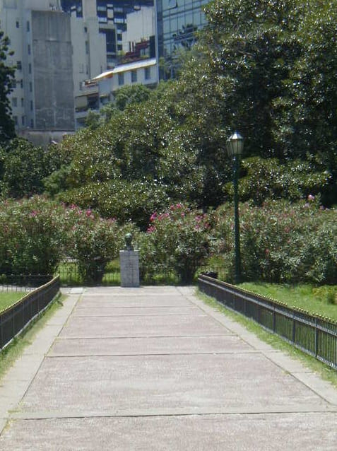 El busto del homenajeado esta instalado sobre base de mampostería revestida en placas de mármol.